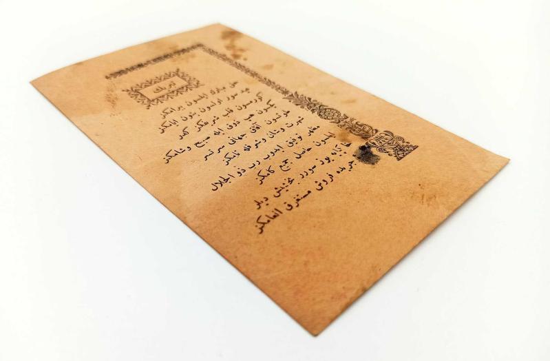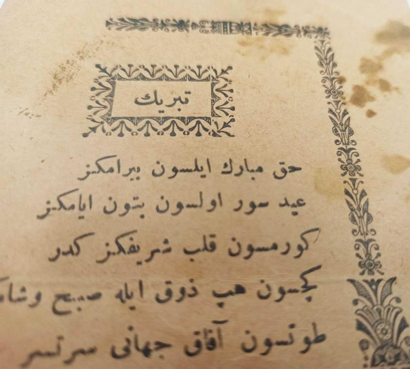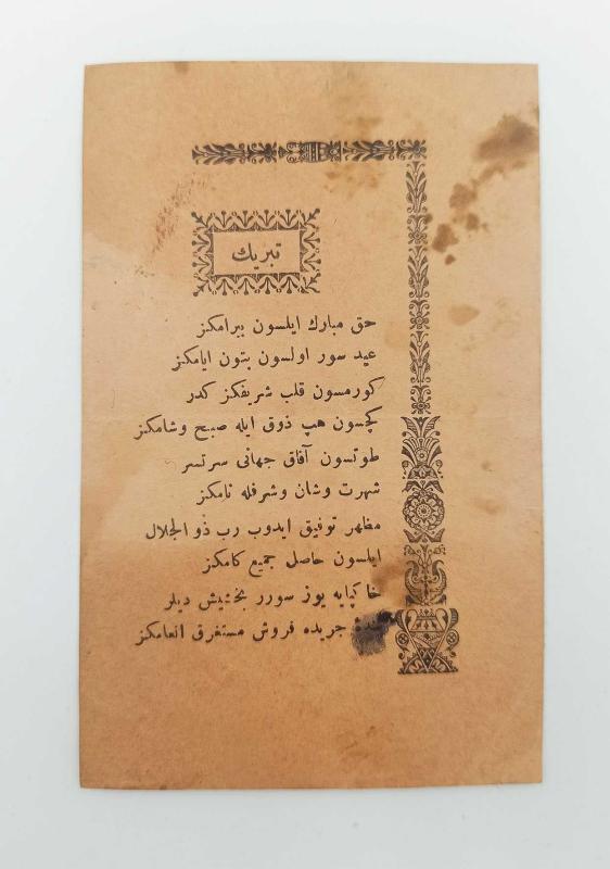 15x10 cm. Ortada kat izi ve kenarlarda hafif lekeler mevcut. Haricen temiz. Arka yüzü boş. "Tebrîk" başlığı dekoratif unsurların arasına başlık olarak yazılı, altında yine sağ yan ve üstteki süslemelerin arasında on mısralık bayram tebriği şiiri: "Hak mübârek eylesin bayramınız Iyd-ı sûr olsun bütün eyyâmınız Görmesin kalb-i şerîfiniz keder Geçsin hep zevk ile sabah ve şâmınız Tütsün afâk-ı cihânı serteser [ser-tâ-ser] Şöhret ve şan ve şeref ile namınız Mazhâr-ı tevfîk edip Rab zû'l-celâl Eylesin hâsıl cemi'-i gamınız Hakpaya yüz sürer bahşiş diler Bende-i cerîde-fürûş müstağrik enâmınız" -- Bayram kültürü Osmanlı kültürü Edebiyat Türk edebiyatı Şiir Efemera Koleksiyon