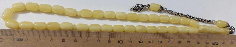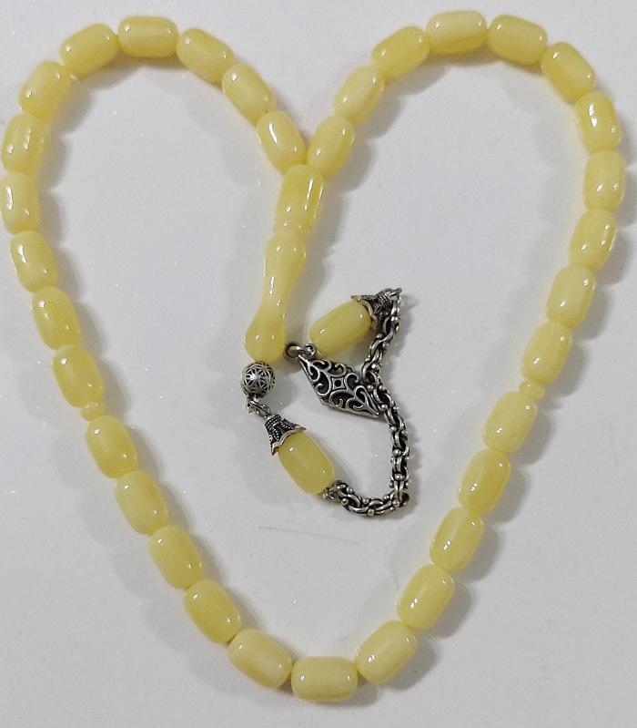 OSMANLI DÖNEMİ OBJEDEN YAPILMA BEYAZ BULUTLU KREM RENGİ HARİKA DAMLA KEHRİBAR TESPİH İKİ YEDEK DANELİ GÜMÜŞ PÜSKÜLLÜ GGG2AA1 ÇOK NADİR başlıklı antika/koleksiyon objesinin menşei belirtilmemiştir. 1950-1999 arası dönemine aittir.