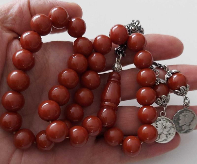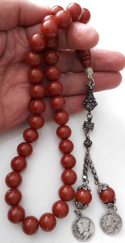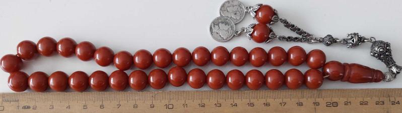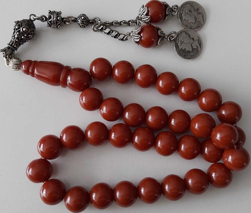 OSMANLI DÖNEMİ OBJEDEN YAPILMA KAHVERENGİ RENKLİ MÜTHİŞ İŞÇİLİKLİ MUHTEŞEM İKİ YEDEK DANELİ GÜMÜŞ PÜSKÜLLÜ SIKMA KEHRİBAR TESPİH R1A1A1A1 ÇOK NADİR başlıklı antika/koleksiyon objesinin menşei belirtilmemiştir. 1940 sonrası dönemine aittir.