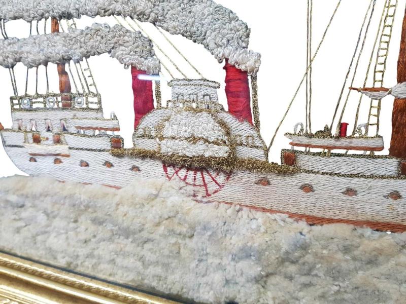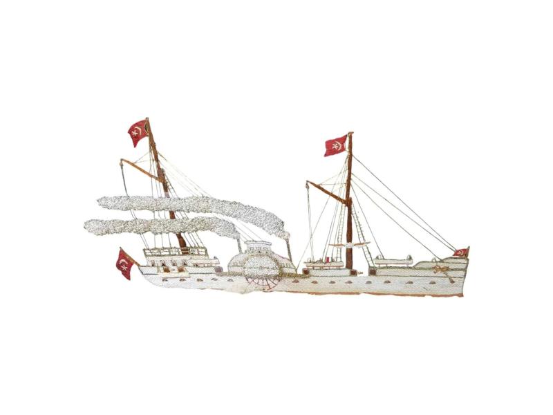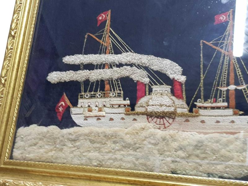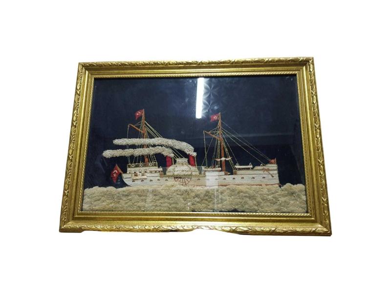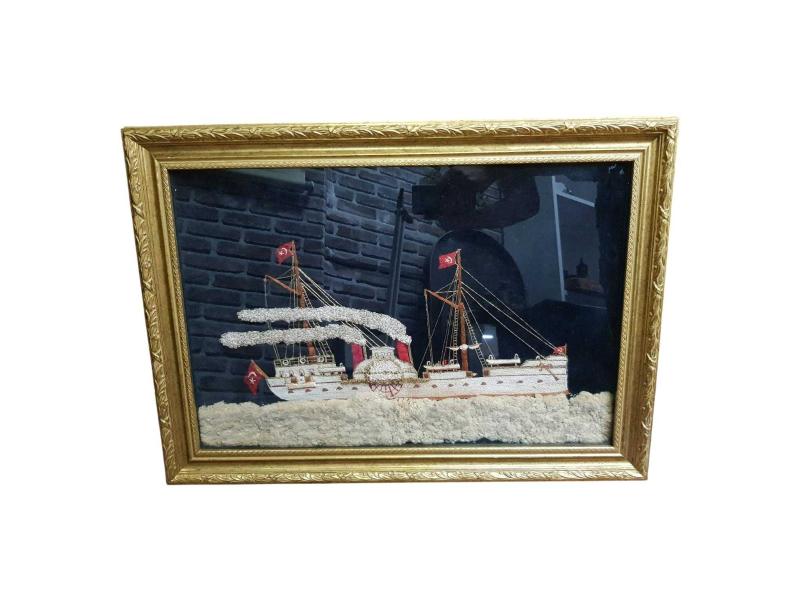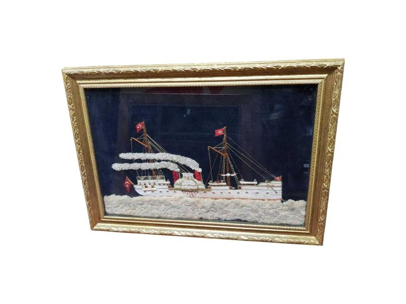 OSMANLI DÖNEMİ YANDAN ÇARKLI VAPUR EL İŞLEME TABLO başlıklı antika/koleksiyon objesi Osmanlı menşe’lidir. 1900-1919 arası dönemine aittir.