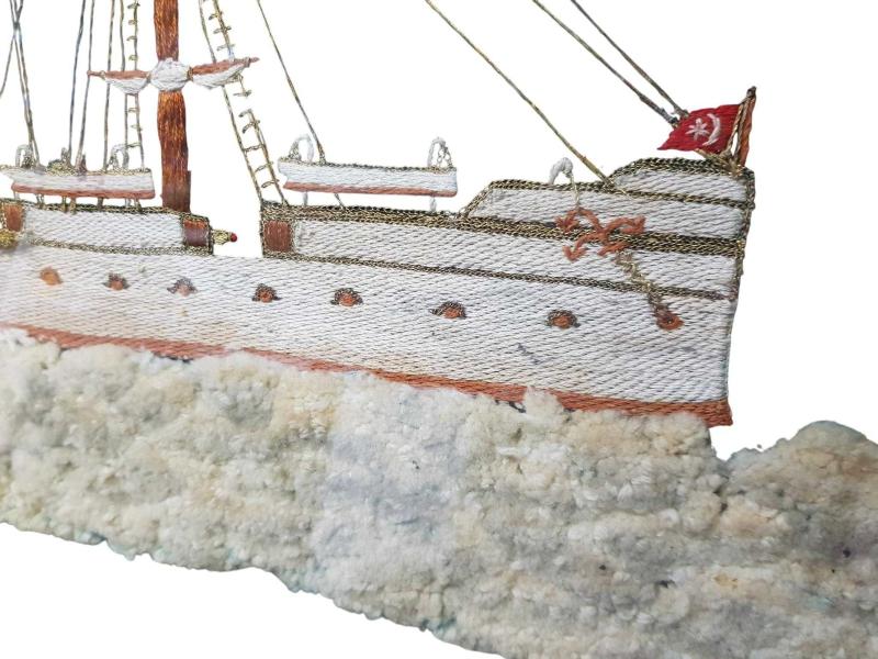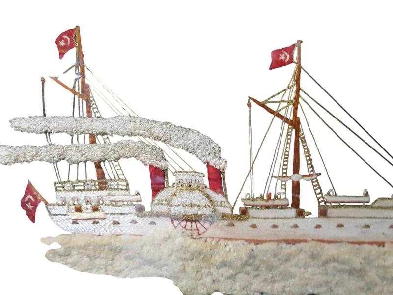 OSMANLI DÖNEMİ İPEK İPLERLE EL İŞLEME TÜRK BAYRAKLARIYLA SÜSLÜ YANDAN ÇARKLI VAPUR TABLOSU. ÇOK NADİR FORMDA VE YÜKSEK KONDİSYONDADIR. EBAT: 70 X 50 CM