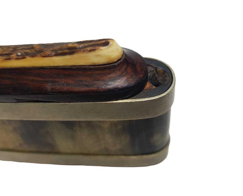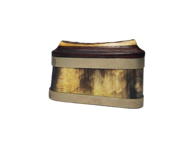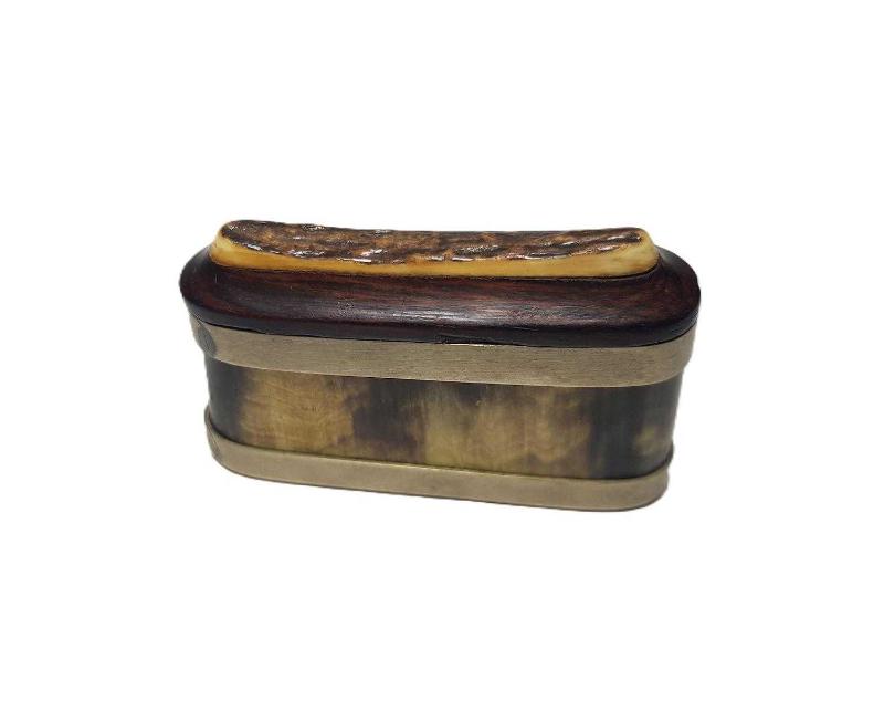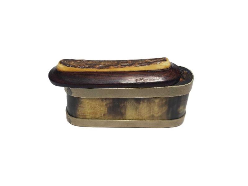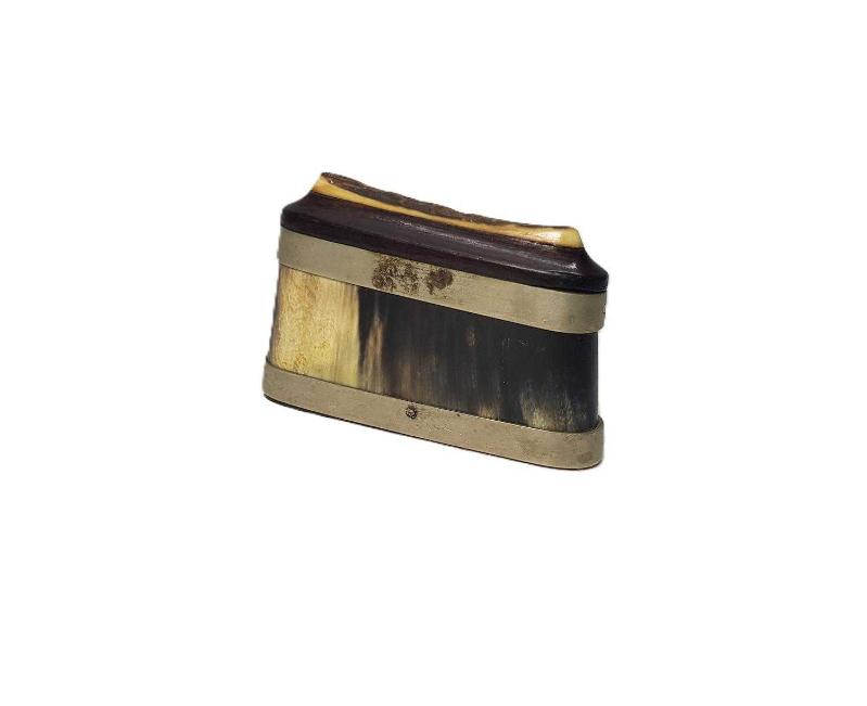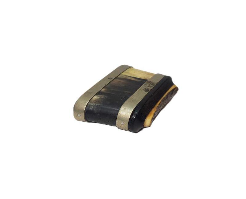 OSMANLI DÖNEMİ BOYNUZ, GEYİK BOYNUZU, PELESENK VE ALPAKADAN MAMÜL, SÜRGÜLÜ KAPAKLI NADİR FORMDA ENFİYE, HAP KUTUSU. EBAT: 9 X 6 X 2,2 CM