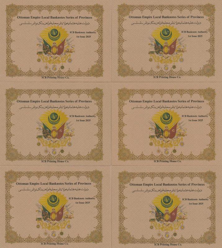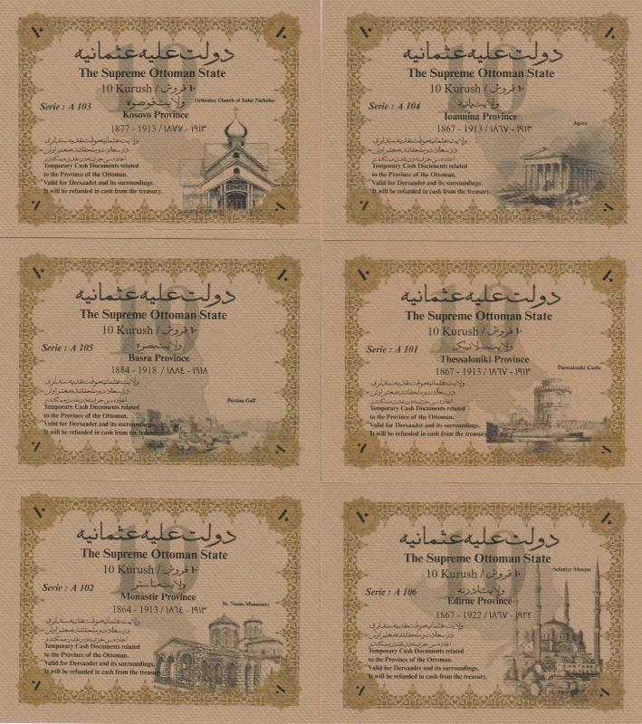 6 Adet küçük ebat banknottan oluşan tam takım; Kosova-Selanik-Manastır-Yanya-Edirne-Basra & ICB Banknote Authority Mevcut set ICB özel iştiraki tarafından hatıra amaçlı olarak dönemin banknot standartlarına benzer olarak üretilmiştir.