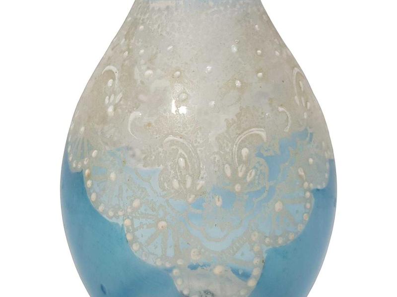 OSMANLI PAZARINA YAPILMIŞ, TABANI STİLİZE KOPARMA, GÖVDESİ BEYAZ MİNELİ ÇİÇEK DESENLERİYLE SÜSLÜ LALEDAN / KARANFİLLİK VAZO. YÜKZEKLİK: 20 CM
