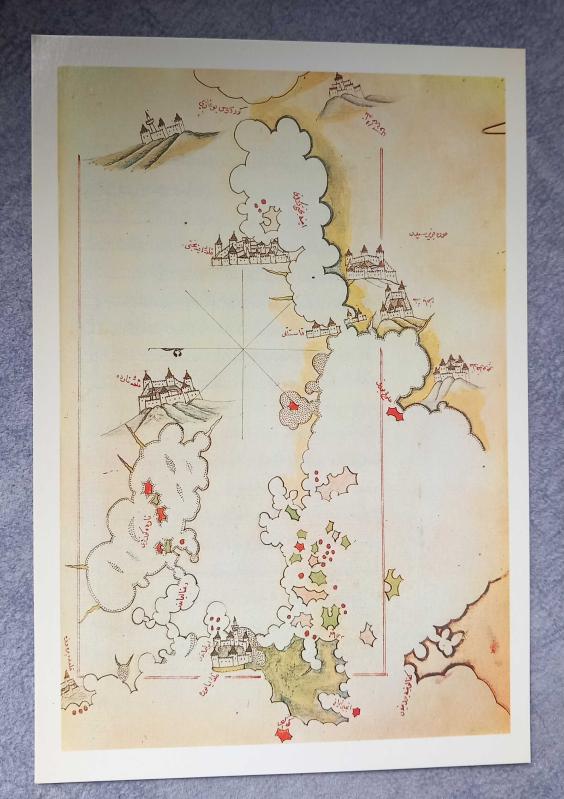OSMANLI MİNYATÜR TEMALI BÜYÜK KARTPOSTAL KONDİSYON YÜKSEK KOLEKSİYONLUK ÖLÇÜ 12 X 17 CM. PİRİ REİS MORA KHERSON LİMANI TEMALI