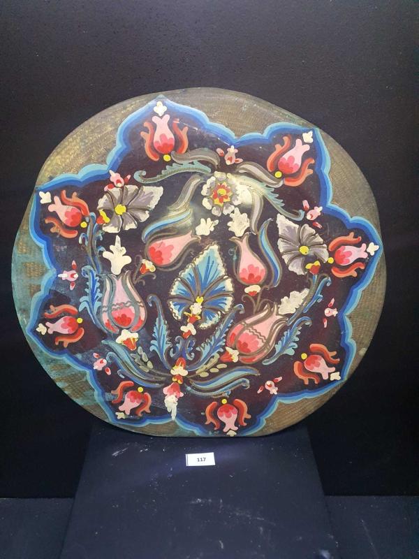 Bakır duvar tabağı el yapımı üzeri renkli mine boya lale ve flora desenli Osmanlı motifli 1960 lar çap 24 cm