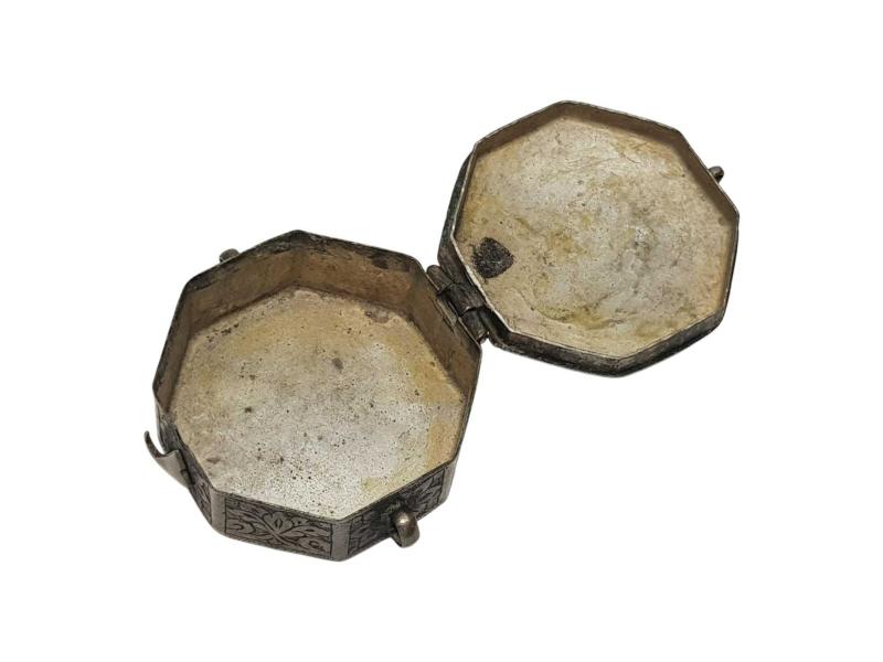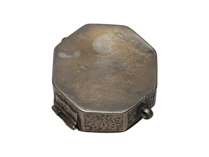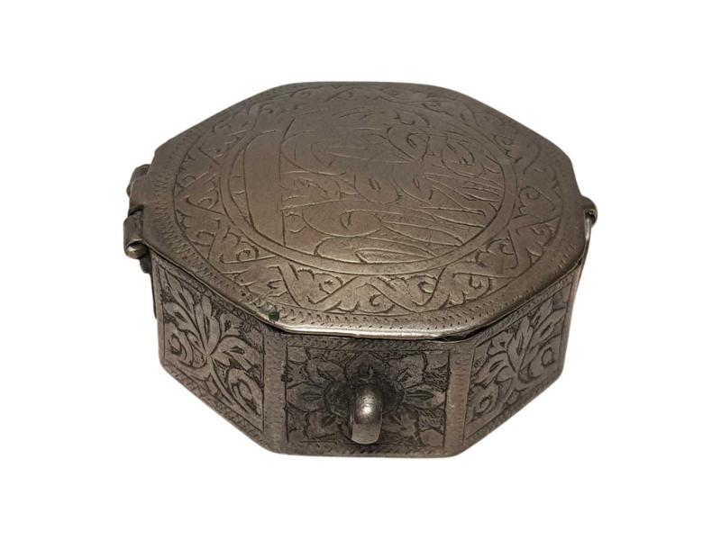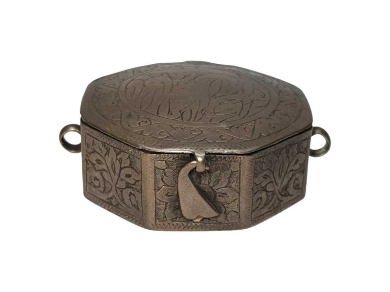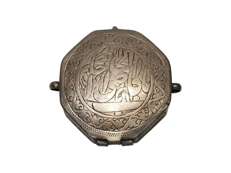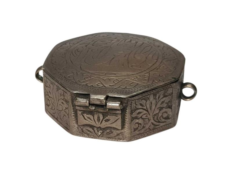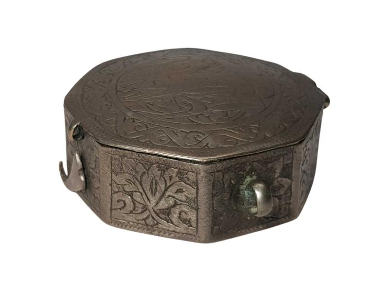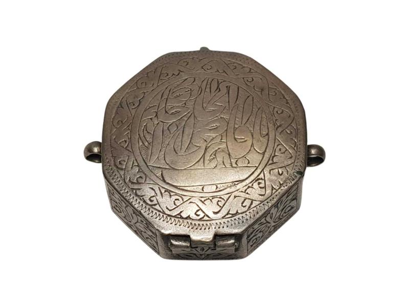 OSMANLI DÖNEMİ EL KAZIMA KALEM İŞÇİLİKLİ DÜŞÜK AYAR GÜMÜŞ SANCAK KUR'AN-I KERİM KABI. SAVAŞTA SANCAKLARA ASILAN NADİR BİR KOLEKSİYON OBJESİDİR. ÜZERİNDE KORUYUCU DUALAR VE AYETLER YER ALMAKTADIR. EBAT: 4,8 X 5,5 X 4,4 X 1,7 CM