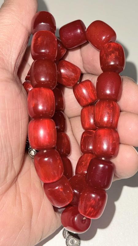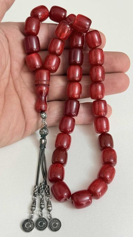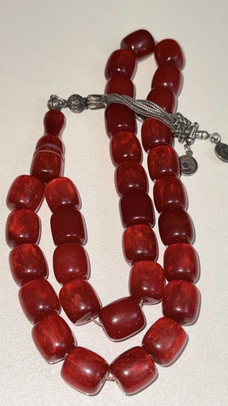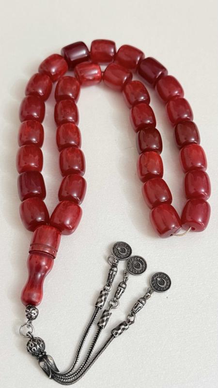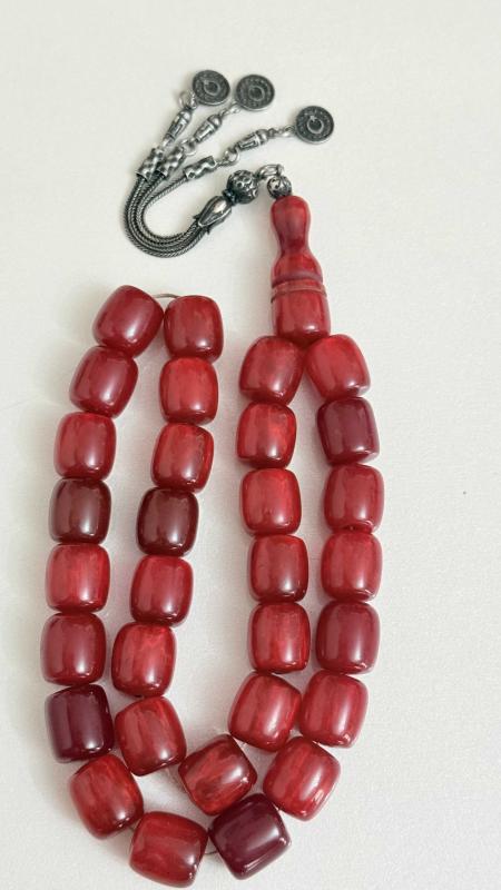 Sıkma kehribar (fenolik reçine / eski Alman–Osmanlı işi Kesme silindir (fıçı) taneler Osmanlı zevki ay-yıldızlı ve tuğra gümüş PÜSKÜL