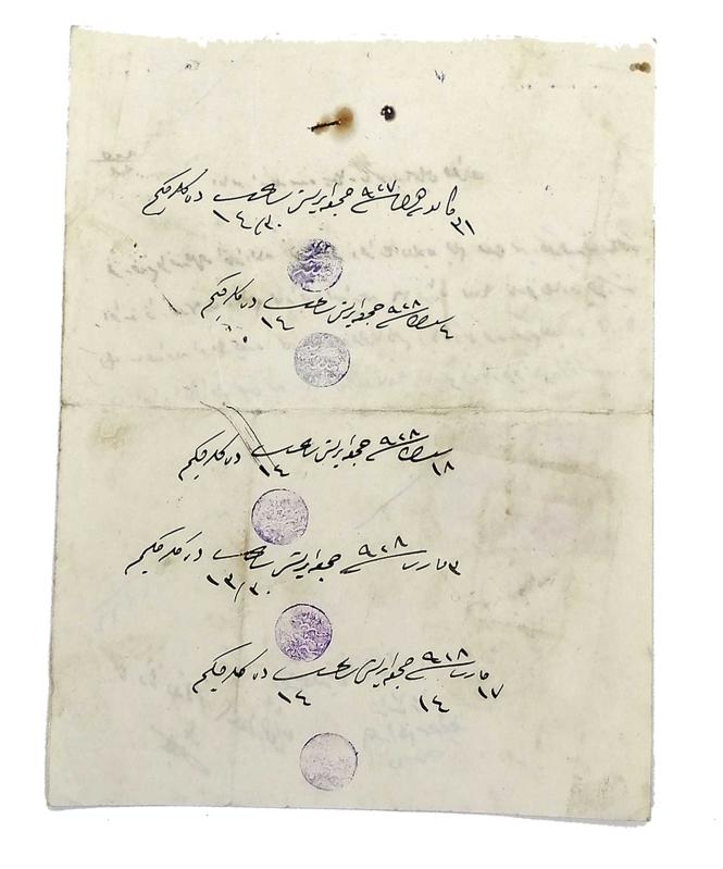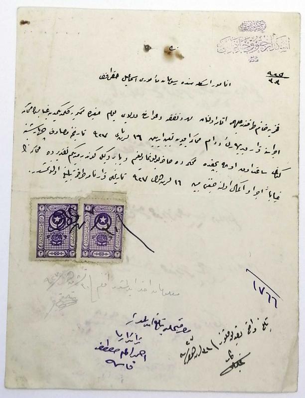 Osmanlıca belge, 21 x 16 cm. 10 satır. 2 sayfa. Antetli kağıt. 2 yüzü de siyah mürekkeple yazılmıştır. Pullu, damgalı. Çok ufak lekenlenme haricinde temiz durumdadır. Tamamı el yazması. [OSMANLI SOSYAL TARİHİ - EVLİLİK - MERSİN] Osmanlıca, el yazma - Anamur iskelesinde Rüsumat memuru İsmail Hakkı Efendi’nin boşanma davası ile ilgili duruşmaya gelmediği takdirde duruşmanın gıyabında yürütüleceğine dair teblîgât. Belgenin arka yüzü çok sayıda mühür ve duruşmanın gün ve saatlerini içerir. -- Osmanlı sosyal tarihi Evlilik Mersin Anamur İzdivaç Sosyal tarih