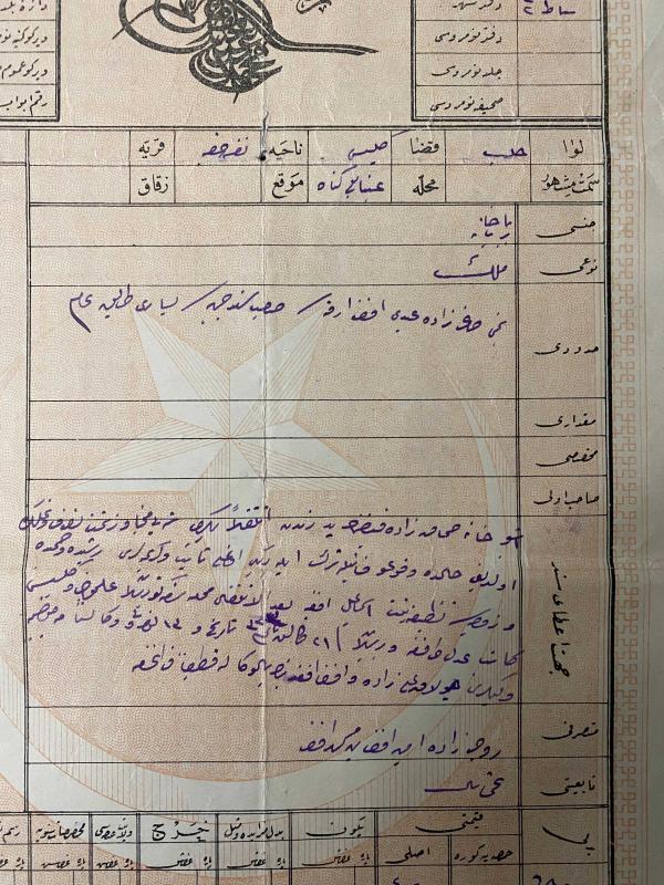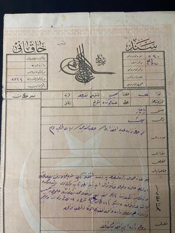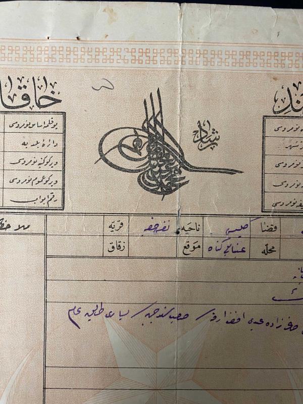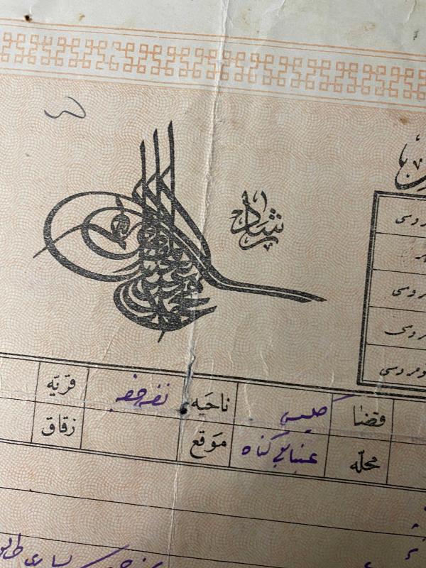 Osmanlı dönemine ait Halep sancağına bağlı İdlib kazasına ait tapu. 1914 yılında düzenlenmiş Sultan Reşad (V. Mehmed) tuğralı “Sened-i Hakani” . . Halep’in İdlib kazasındaki bir tarlanın resmi tapusu. Baba adı Mehmet Efendi olan Ruhizâde Abdu’l-Latif Efendi’ye ait tarla tapusu. . .