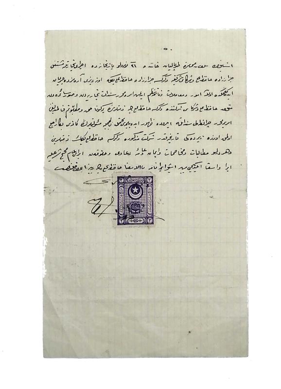 Orijinal Osmanlıca el yazması hukuk belgesi. Osmanlıca el yazma ibranâme: İstanbul'da Sultanhamam'da Topalyan Hanı'nda bulunan Cezzarzâde Ali Bey ve şirketi için düzenlenmiş ibraname. Pullu, imzalı. 20x12,5 cm. Tamamı Osmanlıca. Sekiz satır. Oldukça okunaklı, güzel bir yazı. Tarihsiz.