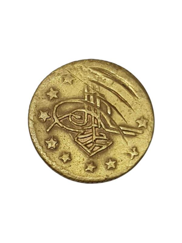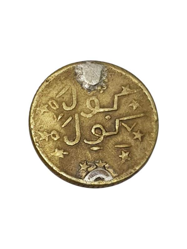 PİRİNÇTEN MAMÜL, BİR YÜZÜNDE TUPRA DİĞER YÜZÜNDE İSE OSMANLICA GÜLE GÜLE YAZISI BULUNAN NADİR KOLYE UCU. ÇAP: 1,5 CM