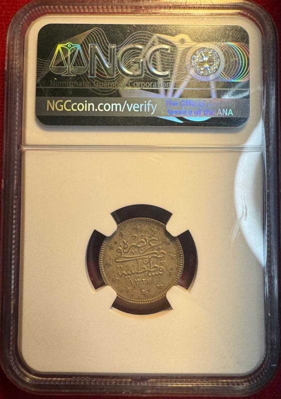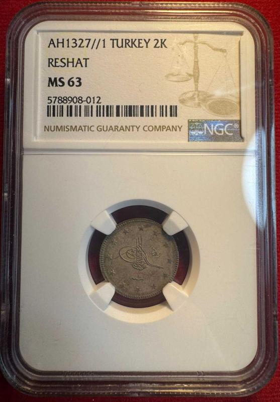 OSMANLI V.MEHMED REŞAD 1909-1918 ( AH 1327-1336) 2 KURUŞ GÜMÜŞ 1327/1 MS 63 ÜRÜN NO: S16 METERYAL:GÜMÜŞ CÜLUS: 1327/1 KONDİSYON: ÇİL NGC SERTİFİKALI :MS 63