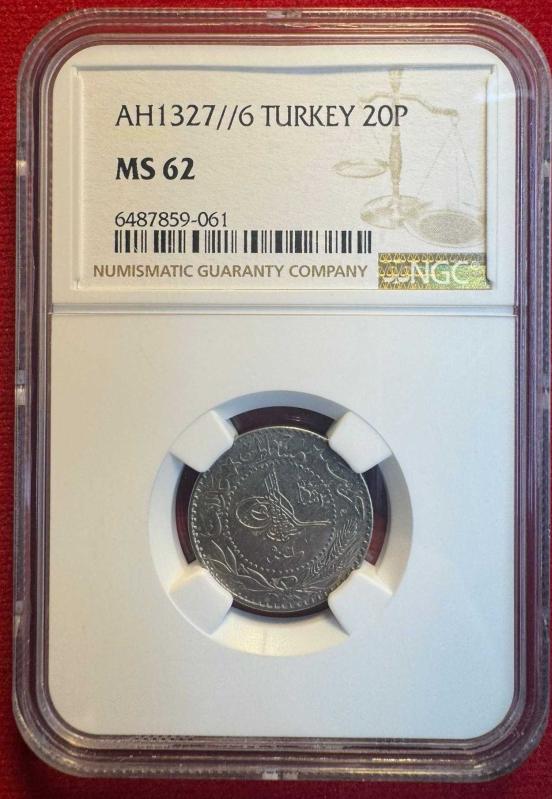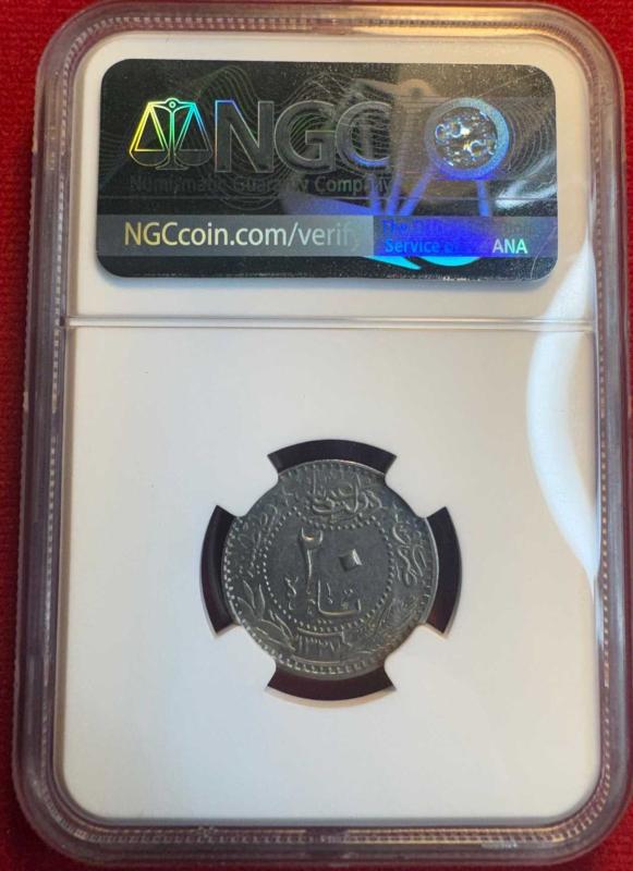 OSMANLI V.MEHMED REŞAD 1909-1918 ( AH 1327-1336) 20 PARA NİKEL 1327/6 MS 62 ÜRÜN NO: S19 METERYAL:NİKEL CÜLUS: 1327/6 KONDİSYON: ÇİL NGC SERTİFİKALI :MS 62