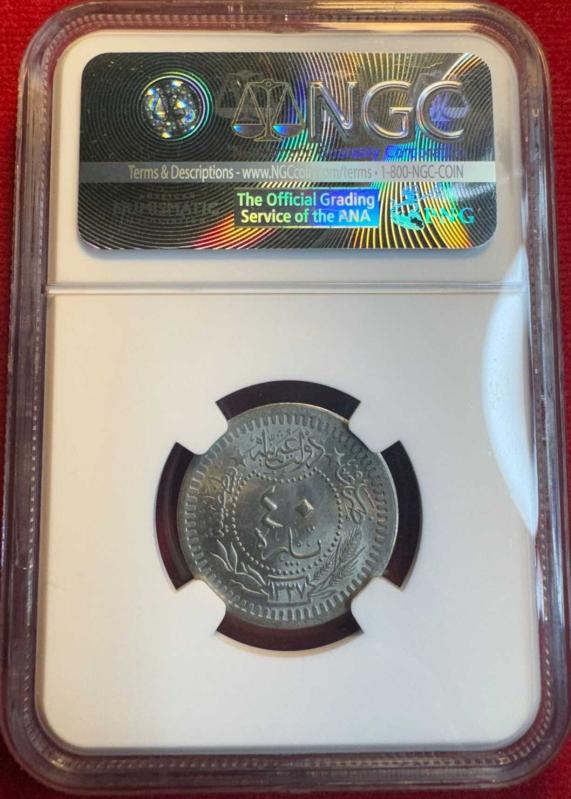 OSMANLI V.MEHMED REŞAD 1909-1918 ( AH 1327-1336) 40PARA NİKEL 1327/8 MS 63 ÜRÜN NO: S20 METERYAL:NİKEL CÜLUS: 1327/8 KONDİSYON: ÇİL NGC SERTİFİKALI :MS 63