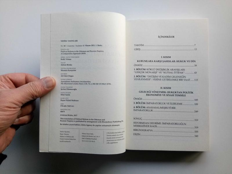 OSMANLI VE RUS İMPARATORLUKLARINDA SİYASİ REFORMLAR (KAŞILAŞTIRMALI BİR YAKLAŞIM) (2. EL), ADRIAN BRISKU tarafından kaleme alınmıştır. Eser MUSTAFA KURTÇELEBİ editörlüğünde hazırlanmıştır. Kitap 2021 yılında YEDİSU YAYINLARI tarafından 978-605-73927-0-1 ISBN kodu ile yayınlanmıştır. Satışta olan kitap, yayınevinin 1. baskısıdır. Bu baskının çevirisi ALİ FAHRİ DOĞAN tarafından yapılmıştır. 352 sayfadır. Sayfa bilgisi 2. HAMUR olarak belirtilmiştir. OSMANLI VE RUS İMPARATORLUKLARINDA SİYASİ REFORMLAR (KAŞILAŞTIRMALI BİR YAKLAŞIM) (2. EL) adlı eser Türkçe dilindedir.