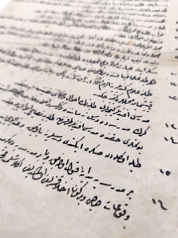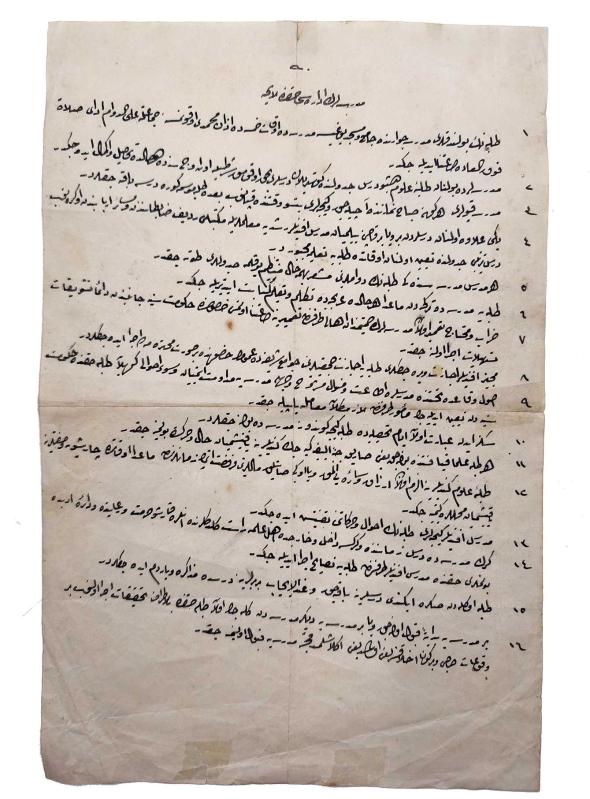 Osmanlıca "Medreselerin İdaresi Hakkında Layiha"Osmanlıca el yazısı ile yazılmış toplam 16 madde olup medreselerin kapılarının açılıp kapanma vakitlerinden, müderris ve talebelerin görevleri ile medreseye alınacak talebeler için yapılacak tahkikattan bahseder. 37x24 cm, arkasında tamir mevcuttur.