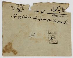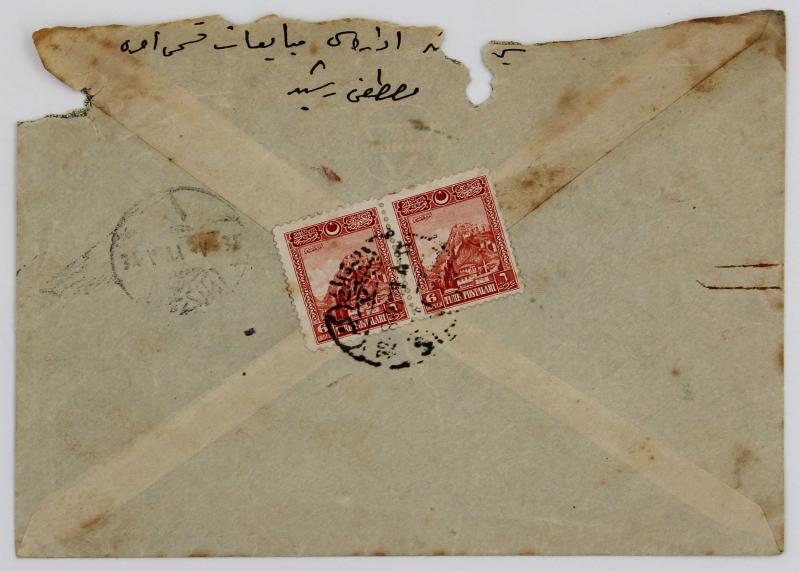 Osmanlıca Bursa vilâyetinde İnegöl'de Eczâne Sâhibi Ali Reşid Bey'in eczânesine gönderilmiş zarf, postadan geçmiş, 16 x 12 cm, ön yüzde damga, arka yüzde iki adet posta pulu ve damgalar ile birlikte. Üst kenarında yıpranmalar vardır, hâliyle.