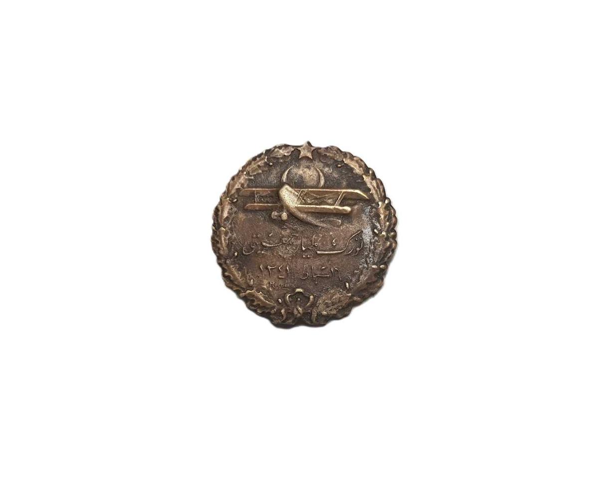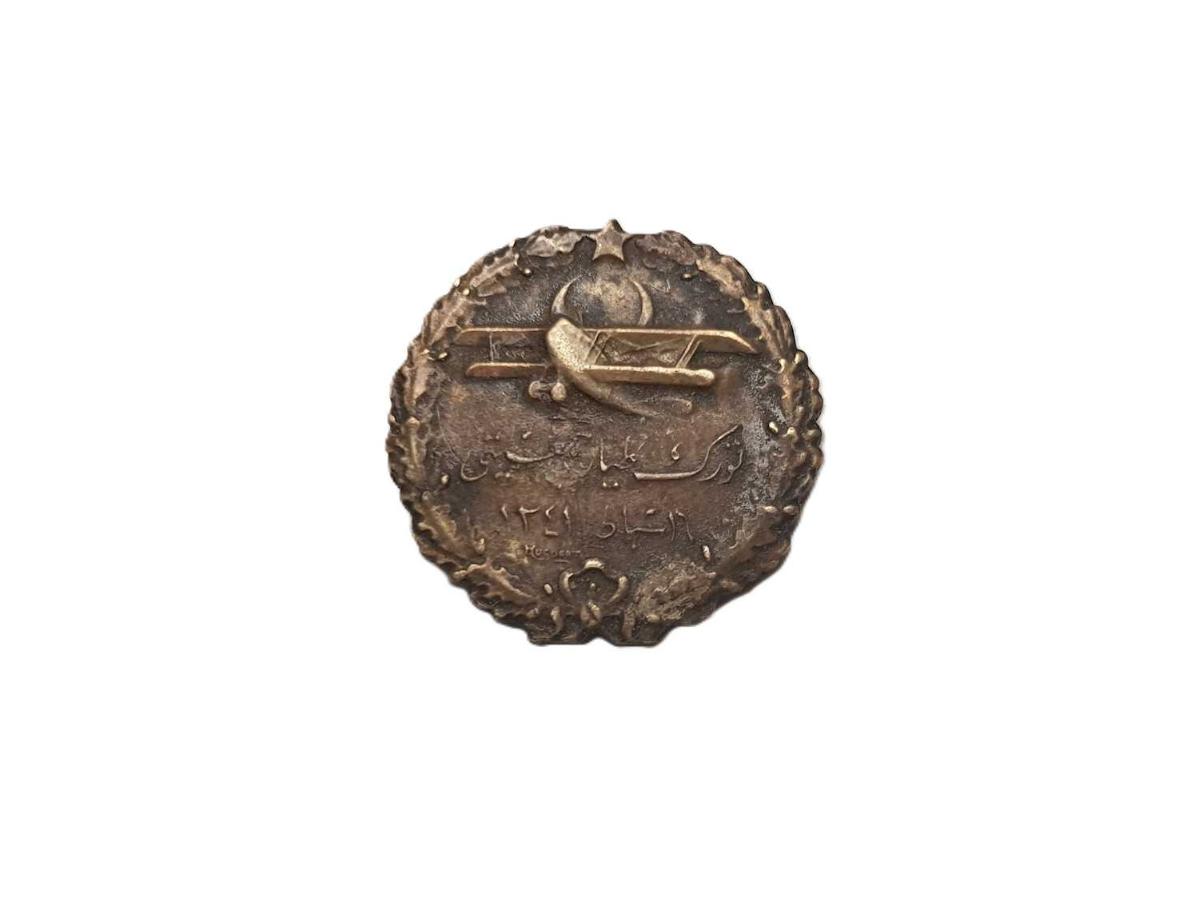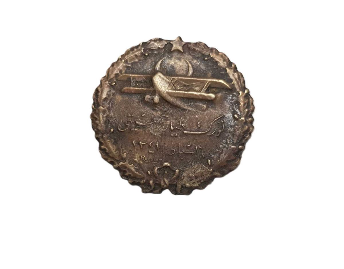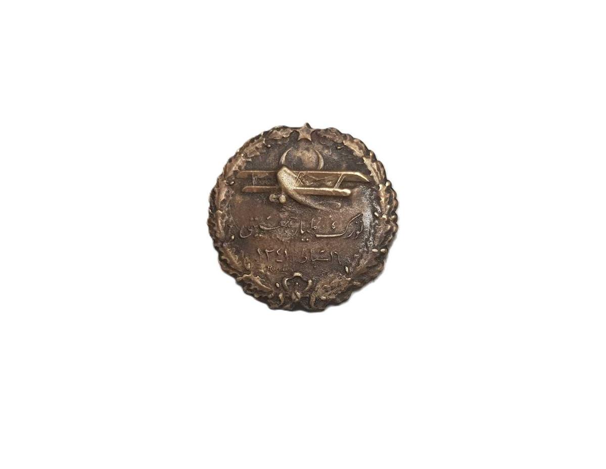 CUMHURİYET İLK DÖNEM, 1925 TARİHLİ BRONZDAN MAMÜL, KENARLARI ÇİÇEK ÇELENGİ FORMLU, AY YILDIZ BAYRAKLI VE UÇAK RESİMLİ VE OSMANLICA "TÜRK TAYYARE CEMİYETİ - 16 ŞUBAT 1341 (1925)" YAZILI VE ALTINDA HUGUENIN USTA İMZASI İLE ARKA KISMINDA DA YİNE OSMANLICA "İSVİÇRE" VE FRANSIZCA "HUGUENIN LOCLE SUISSE" YAZILARI BULUNAN ÇOK NADİR ROZET. ÇAP: 2 CM