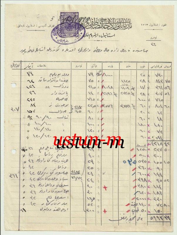 ** NARMANLI ZADE HADJI MOUSTAFA OSMANLICA FATURA ** A4 ebadında,Osmanlıca yazılı,fiskal pullu,gayet temiz durumda orijinal faturadır...