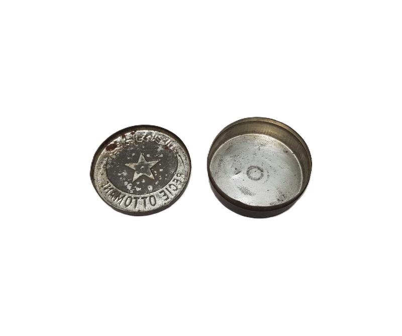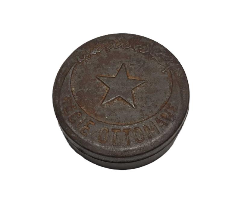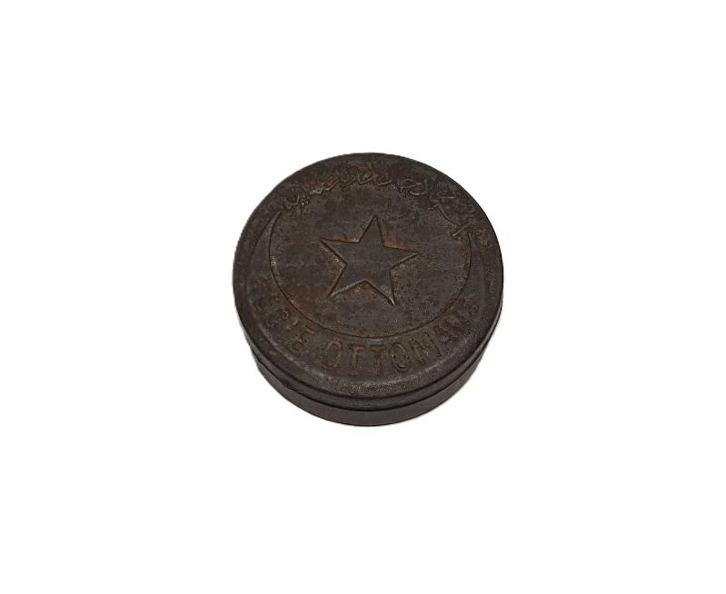 OSMANLI DÖNEMİ ÜZERİ AY YILDIZLI BAYRAKLA SÜSLÜ VE OSMANLICA "İNHİSARI DÜHAN DEVLETİ OSMANİYE" - FRANSIZCA "REGI OTTOMANE" YAZILI TENEKE TÜTÜN KUTUSU EBAT: 5,6 X 2 CM