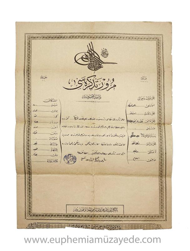 [OSMANLI'DA SEYAHAT KÜLTÜRÜ / ERKEN DÖNEM PASAPORT] Osmanlıca İkinci Abdülhamid tuğralı Mürur Tezkeresi İstanbul'da Üsküdar'da ikamet eden Hacı Mustafa'nın Ereğli'ye azîmeti [gidişi] dolayısıyla verilen yolculuk izni, 1302 [1886] tarihli başlıklı ürün, Efemera, Müzik, Sinema > Belge ve Evraklar > Osmanlıca Belgeler kategorisi altında İkinci El olarak satılmaktadır.