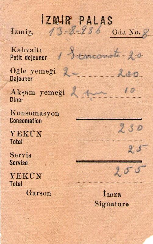 OTEL İZMİR PALAS FATURA 1936,13 AĞUSTOS başlıklı antika/koleksiyon objesinin menşei belirtilmemiştir. Objenin ait olduğu dönem bilinmeketedir.