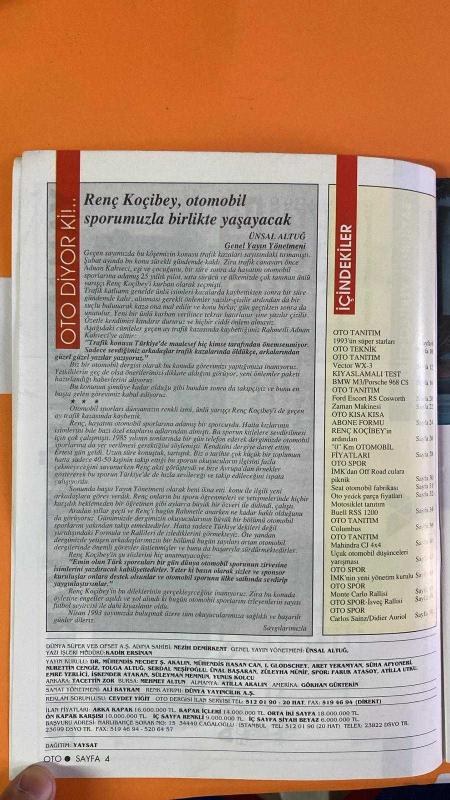 OTO MOTOR - SPOR - MAGAZİN DERGİSİ - MART 1993 – RENÇ KOÇİBEY – BMW 3 – PORSCHE 968 CS – VECTOR VX-3 – FORD ESCORT RS COSWORTH – COLUMBUS – MAHINDRA CJ 4X4 – MONTE CARLO RALLİSİ – İSVEÇ RALLİSİ – CARLOS SAINZ – DIDIER AURIOL – HONDA LEGEND V6 – LANCIA DEDRA COUPE – V6 MOTOR – 3000 CC – ABS FREN SİSTEMİ – MINI METRO – ROVER 100 – BMW 3 COUPE – 1800 CC – 2500 CC – BMW 7 SERİSİ – OPEL – ITT – SWF – ULTRASONİK PARK SİSTEMİ – 80 CM MESAFE UYARISI – 20 CM SÜREKLİ SİNYAL – BOSCH – BUELL RSS 1200 – SEAT OTOMOBİL FABRİKASI – İMK OFF ROAD – İMK YENİ YÖNETİM KURULU – UÇUK OTOMOBİL DÜŞÜNCELERİ YARIŞMASI – ADNAN KAHVECİ – ÜNSAL ALTUĞ – NEZİH DEMİRKENT – KADİR ERSİNAN – NECDET Ş. AKALIN – HASAN CAN – I. GLODSCHEY – ARET YERAMYAN – SÜHA AFYONERİ – NURETTİN CENGİZ – TOLGA ALTUĞ – SERDAL NEŞİFOĞLU – ÜNAL BAŞARAN – ZÜLEYHA MÜNİF – FARUK ATASOY – ATİLLA UTKU – EMRE YERLİCİ – İSKENDER ATAKAN – SÜLEYMAN MEMNUN – YUNUS KOLCU – TACETTİN ZOR – MEHMET ALTUN – ATILLA AKALIN – GÖKHAN GÜRTEKİN – ALİ BAYR–50 SAYFA adlı eser Türkçe dilindedir.