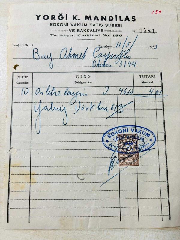 OTOMOBİL BENZİN FATURASI - 11 MAYIS 1953 - YORĞİ K.MANDİLAS - SOKONİ VAKUM SATIŞ ŞUBESİ VE BAKKALİYE - TARABYA, İSTANBUL- AHMET ÇAYIROĞLU - ISLAK İMZALI, KAŞELİ DAMGA PULU - 17 x 22 cm EBATLI ORİJİNAL FATURA, en son 1 yıl önce güncellenmiştir.