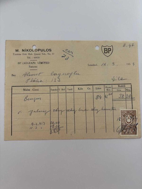 OTOMOBİL BENZİN FATURASI - 12 EYLÜL 1954 - M.NİKOLOPULOS - BP (AEGEAN) LİMİTED - ŞİLE, İSTANBUL - AHMET ÇAYIROĞLU - ISLAK İMZALI, KAŞELİ DAMGA PULU - 13 x 17 cm EBATLI ORİJİNAL FATURA, en son 1 yıl önce güncellenmiştir.