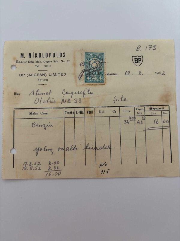 OTOMOBİL BENZİN FATURASI - 19 AĞUSTOS 1952 - M.NİKOLOPULOS - BP (AEGEAN) LİMİTED - ŞİLE, İSTANBUL - AHMET ÇAYIROĞLU - ISLAK İMZALI, KAŞELİ DAMGA PULU - 13 x 17 cm EBATLI ORİJİNAL FATURA, en son 1 yıl önce güncellenmiştir.