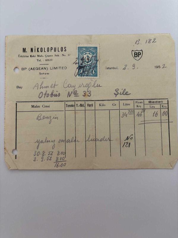 OTOMOBİL BENZİN FATURASI - 2 EYLÜL 1952 - M.NİKOLOPULOS - BP (AEGEAN) LİMİTED - ŞİLE, İSTANBUL - AHMET ÇAYIROĞLU - ISLAK İMZALI, KAŞELİ DAMGA PULU - 13 x 17 cm EBATLI ORİJİNAL FATURA, en son 1 yıl önce güncellenmiştir.