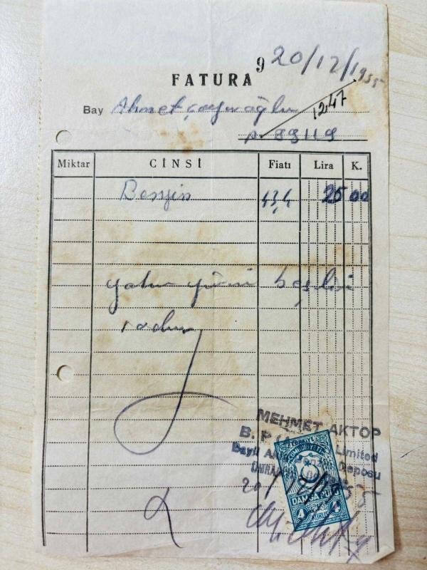 OTOMOBİL BENZİN FATURASI - 20 ARALIK 1955 - MEHMET AKTOP - B.P (AEGEAN) LİMİTED BAYİİ AKİŞ BENZİN DEPOSU - ÜMRANİYE, İSTANBUL - AHMET ÇAYIROĞLU - ISLAK İMZALI, KAŞELİ DAMGA PULU - 12 x 19 cm EBATLI ORİJİNAL FATURA, en son 1 yıl önce güncellenmiştir.
