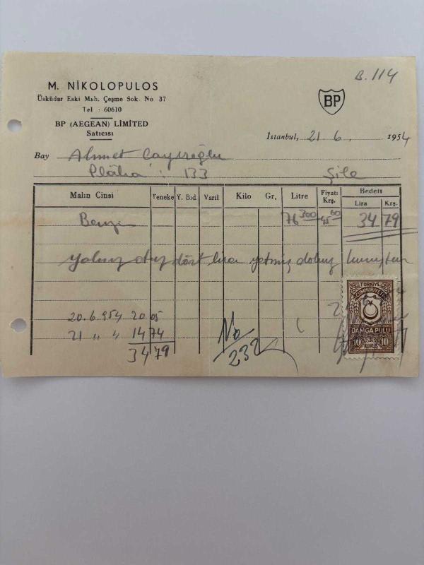OTOMOBİL BENZİN FATURASI - 21 HAZİRAN 1954 - M.NİKOLOPULOS - BP (AEGEAN) LİMİTED - ŞİLE, İSTANBUL - AHMET ÇAYIROĞLU - ISLAK İMZALI, KAŞELİ DAMGA PULU - 13 x 17 cm EBATLI ORİJİNAL FATURA, en son 1 yıl önce güncellenmiştir.