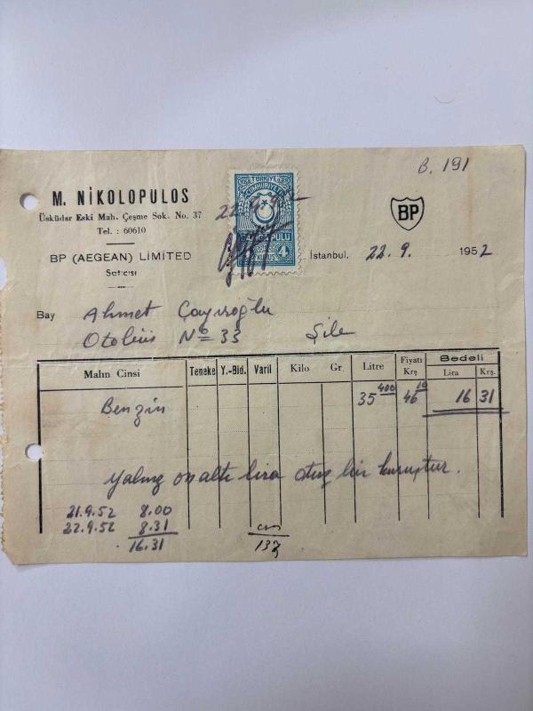 OTOMOBİL BENZİN FATURASI - 22 EYLÜL 1952 - M.NİKOLOPULOS - BP (AEGEAN) LİMİTED - ŞİLE, İSTANBUL - AHMET ÇAYIROĞLU - ISLAK İMZALI, KAŞELİ DAMGA PULU - 13 x 17 cm EBATLI ORİJİNAL FATURA, en son 1 yıl önce güncellenmiştir.