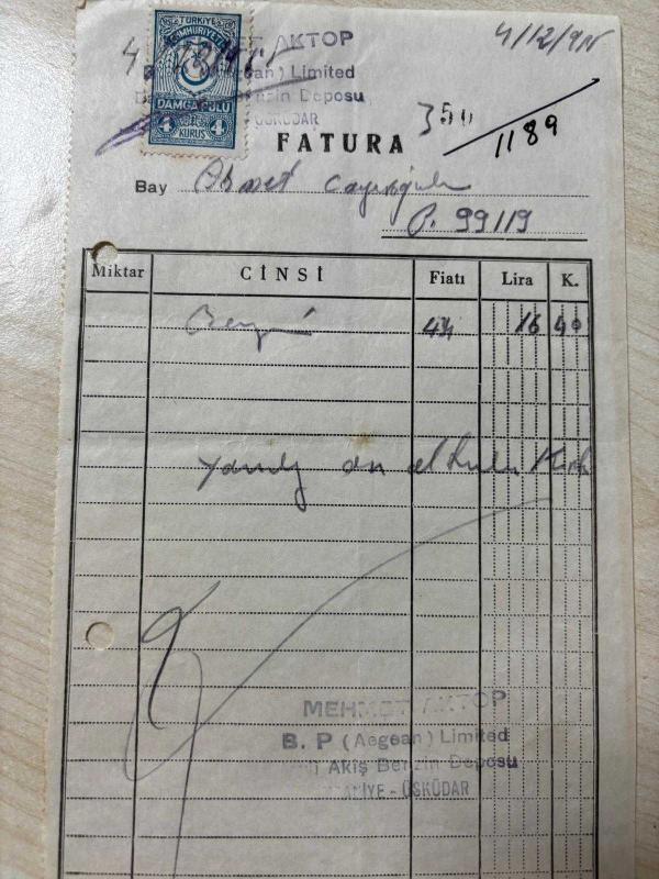 OTOMOBİL BENZİN FATURASI - 4 ARALIK 1955 - MEHMET AKTOP - B.P (AEGEAN) LİMİTED BAYİİ AKİŞ BENZİN DEPOSU - ÜMRANİYE, İSTANBUL - AHMET ÇAYIROĞLU - ISLAK İMZALI, KAŞELİ DAMGA PULU - 12 x 19 cm EBATLI ORİJİNAL FATURA, en son 1 yıl önce güncellenmiştir.