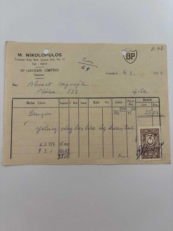 OTOMOBİL BENZİN FATURASI - 4 MART 1954 - M.NİKOLOPULOS - BP (AEGEAN) LİMİTED - ŞİLE, İSTANBUL - AHMET ÇAYIROĞLU - ISLAK İMZALI, KAŞELİ DAMGA PULU - 13 x 17 cm EBATLI ORİJİNAL FATURA, en son 1 yıl önce güncellenmiştir.