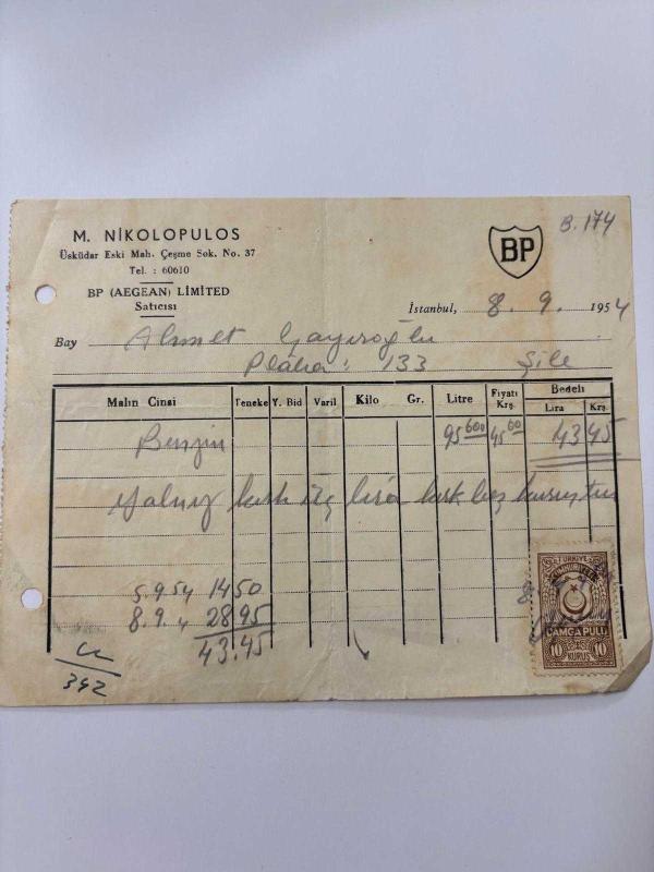 OTOMOBİL BENZİN FATURASI - 8 EYLÜL 1954 - M.NİKOLOPULOS - BP (AEGEAN) LİMİTED - ŞİLE, İSTANBUL - AHMET ÇAYIROĞLU - ISLAK İMZALI, KAŞELİ DAMGA PULU - 13 x 17 cm EBATLI ORİJİNAL FATURA, en son 1 yıl önce güncellenmiştir.