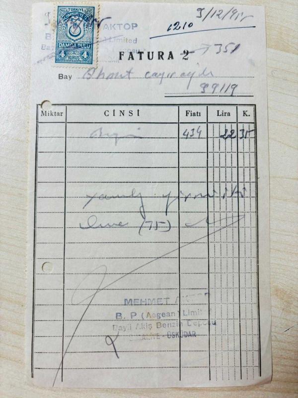 OTOMOBİL BENZİN FATURASI - 9 ARALIK 1955 - MEHMET AKTOP - B.P (AEGEAN) LİMİTED BAYİİ AKİŞ BENZİN DEPOSU - ÜMRANİYE, İSTANBUL - AHMET ÇAYIROĞLU - ISLAK İMZALI, KAŞELİ DAMGA PULU - 12 x 19 cm EBATLI ORİJİNAL FATURA, en son 1 yıl önce güncellenmiştir.