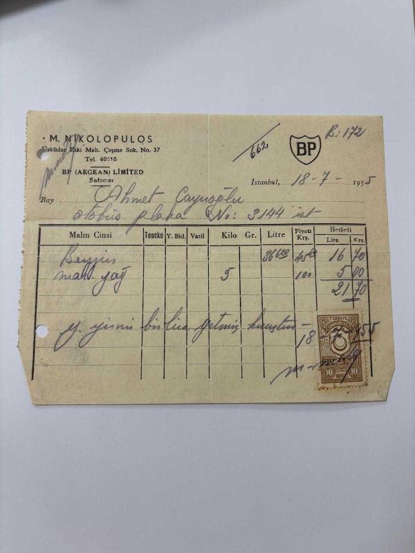 OTOMOBİL BENZİN, MOTOR YAĞI FATURASI - 18 TEMMUZ 1955 - M.NİKOLOPULOS - BP (AEGEAN) LİMİTED - ŞİLE, İSTANBUL - AHMET ÇAYIROĞLU - ISLAK İMZALI, KAŞELİ DAMGA PULU - 13 x 17 cm EBATLI ORİJİNAL FATURA, en son 1 yıl önce güncellenmiştir.