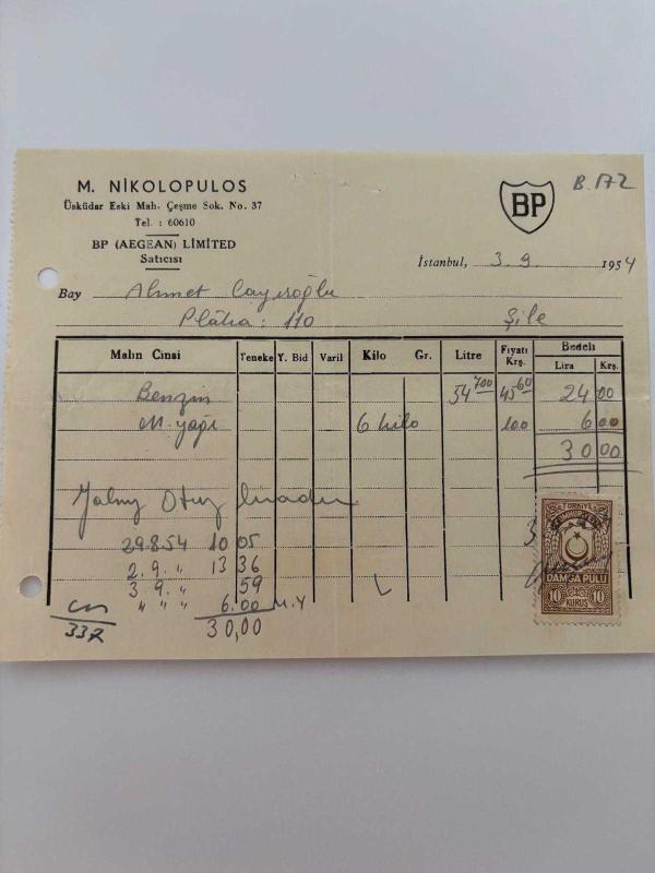 OTOMOBİL BENZİN, MOTOR YAĞI FATURASI - 3 EYLÜL 1954 - M.NİKOLOPULOS - BP (AEGEAN) LİMİTED - ŞİLE, İSTANBUL - AHMET ÇAYIROĞLU - ISLAK İMZALI, KAŞELİ DAMGA PULU - 13 x 17 cm EBATLI ORİJİNAL FATURA, en son 1 yıl önce güncellenmiştir.