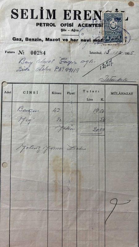 OTOMOBİL BENZİN, YAĞ FATURASI - 15 ARALIK 1955 - SELİM ERENGİL - PETROL OFİSİ ACENTESİ - ŞİLE, İSTANBUL - AHMET ÇAYIROĞLU - ISLAK İMZALI, KAŞELİ DAMGA PULU - 15 x 25 cm EBATLI ORİJİNAL FATURA, en son 1 yıl önce güncellenmiştir.
