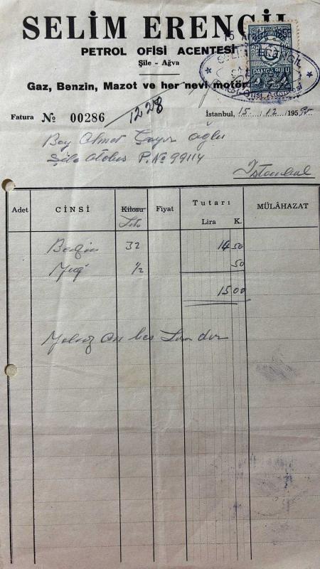 OTOMOBİL BENZİN, YAĞ FATURASI - 15 ARALIK 1955 - SELİM ERENGİL - PETROL OFİSİ ACENTESİ - ŞİLE, İSTANBUL - AHMET ÇAYIROĞLU - ISLAK İMZALI, KAŞELİ DAMGA PULU - 15 x 25 cm EBATLI ORİJİNAL FATURA, en son 1 yıl önce güncellenmiştir.
