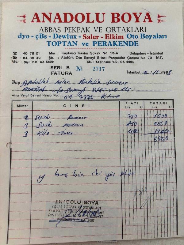 OTOMOBİL BOYA, MACUN FATURASI - 2 KASIM 1983 - ANADOLU BOYA - ABBAS PEKPAK VE ORTAKLARI - OTO BOYALARI TOPTAN VE PERAKENDE - ŞİŞLİ, İSTANBUL- BAHATTİN SAVUR, ABDULLAH ASLAN - ISLAK İMZALI, KAŞELİ DAMGA PULU - 18 x 22 cm EBATLI ORİJİNAL FATURA, en son 1 yıl önce güncellenmiştir.