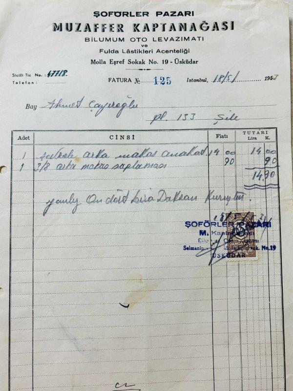 OTOMOBİL PARÇALARI FATURASI - 18 MAYIS 1953 - ŞÖFÖRLER PAZARI - MUZAFFER KAPTANAĞASI - ŞİLE, ÜSKÜDAR , İSTANBUL - AHMET ÇAYIROĞLU - ISLAK İMZALI, KAŞELİ DAMGA PULU - 28 x 21 cm EBATLI ORİJİNAL FATURA, en son 1 yıl önce güncellenmiştir.