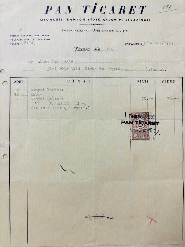 OTOMOBİL SİNYAL LAMBASI, KABLO, SİNYAL ŞALTERİ FATURASI - 1 TEMMUZ 1953 - PAN TİCARET - OTOMOBİL, KAMYON YEDEK AKSAM VE LEVAZIMATI - TAKSİM , İSTANBUL- AHMET ÇAYIROĞLU - ISLAK İMZALI, KAŞELİ DAMGA PULU - 28 x 21 cm EBATLI ORİJİNAL FATURA, 1 yıl önce satışa sunulmuştur.