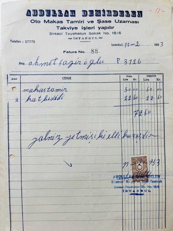 OTOMOBİL TAMİR FATURASI - 11 ŞUBAT 1953 - ABDULLAH DEMİRDELEN - OTO MAKAS TAMİRİ ŞASE UZAMASI - SİRKECİ, İSTANBUL- AHMET ÇAYIROĞLU - ISLAK İMZALI, KAŞELİ DAMGA PULU - 28 x 21 cm EBATLI ORİJİNAL FATURA, en son 1 yıl önce güncellenmiştir.