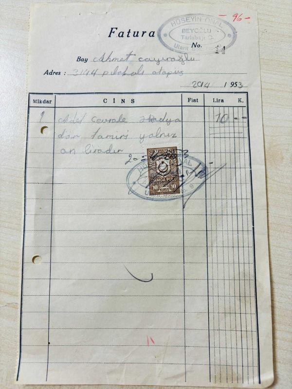 OTOMOBİL TAMİR FATURASI - 20 NİSAN 1953 - HÜSEYİN ÖNAL - BEYOĞLU, İSTANBUL - AHMET ÇAYIROĞLU - ISLAK İMZALI, KAŞELİ DAMGA PULU - 15 x 20 cm EBATLI ORİJİNAL FATURA, en son 1 yıl önce güncellenmiştir.