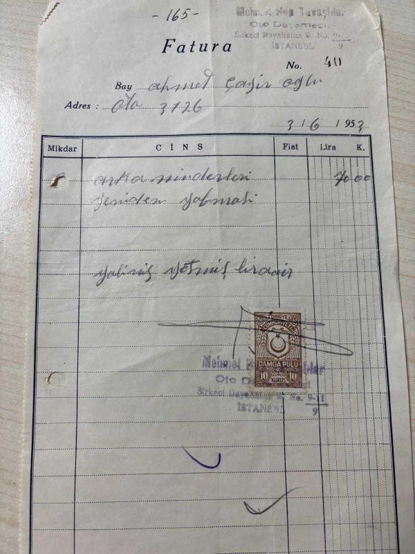 OTOMOBİL TAMİRAT FATURASI - 3 HAZİRAN 1953 - MEHMET HEP TAVAŞLILAR - OTO DÖŞEMECİSİ - SİRKECİ, İSTANBUL - AHMET ÇAYIROĞLU - ISLAK İMZALI, KAŞELİ DAMGA PULU - 18 x 24 cm EBATLI ORİJİNAL FATURA, en son 1 yıl önce güncellenmiştir.