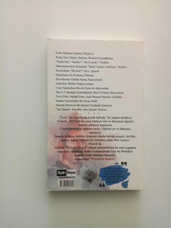 Fatih Mehmet İsminin Hikâyesi Kitap Yere Düştü; Baktım, İbrahim Kaypakkaya "Nedir Bu? " Dedim? " Bu Ezandır." Dediler Süleymancıların Köyünde “Hadi Camiye Gidelim!” Dediler Kaymakam “Bu kim?” Diye Şaşırdı Hayatımın En Korkunç Dönemi Devrimciler Galiba Yanlış Yapıyorlardı Askerlere Bildiri Dağıtıyordum Cem Tutulurken Ben de Eşim de Ağlıyorduk Son 2-3 Sandığa Gelindiğinde, Ben O Kitabı Okuyordum Terzi Fikri, Mehdi Zana, Juan Manuel Sánchez Gordillo… Saadet Partisi'nden Bir Grup Geldi Dersim Merkezli Bir Model Yaratmak İstiyoruz “İşe Yaradı” Desinler, Her Şeyimi Veririm “Ücra” bir coğrafyada kendi halinde bir yaşam sürdüren Ovacık, 2014’ten bu yana Türkiye’nin ve dünyanın ilgisini üzerine çekmeyi başarıyor. Çünkü Ovacık’ta yeşeren umut, Türkiye’ye ve dünyaya yayılıyor. İnsana, doğaya, kültüre, kısacası cümle varlığa saygılı, birlikte üreten, hakça bölüşen bir sistemin uçları filiz veriyor Ovacık’ta. Giderek “Ovacık Modeli” olarak nitelendirilen bu yeni yaşamın taşıyıcısı, emekçisi, önderi konumundaki kişi ise Belediye Başkanı Fatih Mehmet Maçoğlu. Namı diğer “Komünist Başkan” Peki Komünist Başkan kimdir? Ovacık Modeli nedir? Elinizdeki kitap, bu soruların yanıtını verme çabasının sonucu olarak ortaya çıkmıştır.